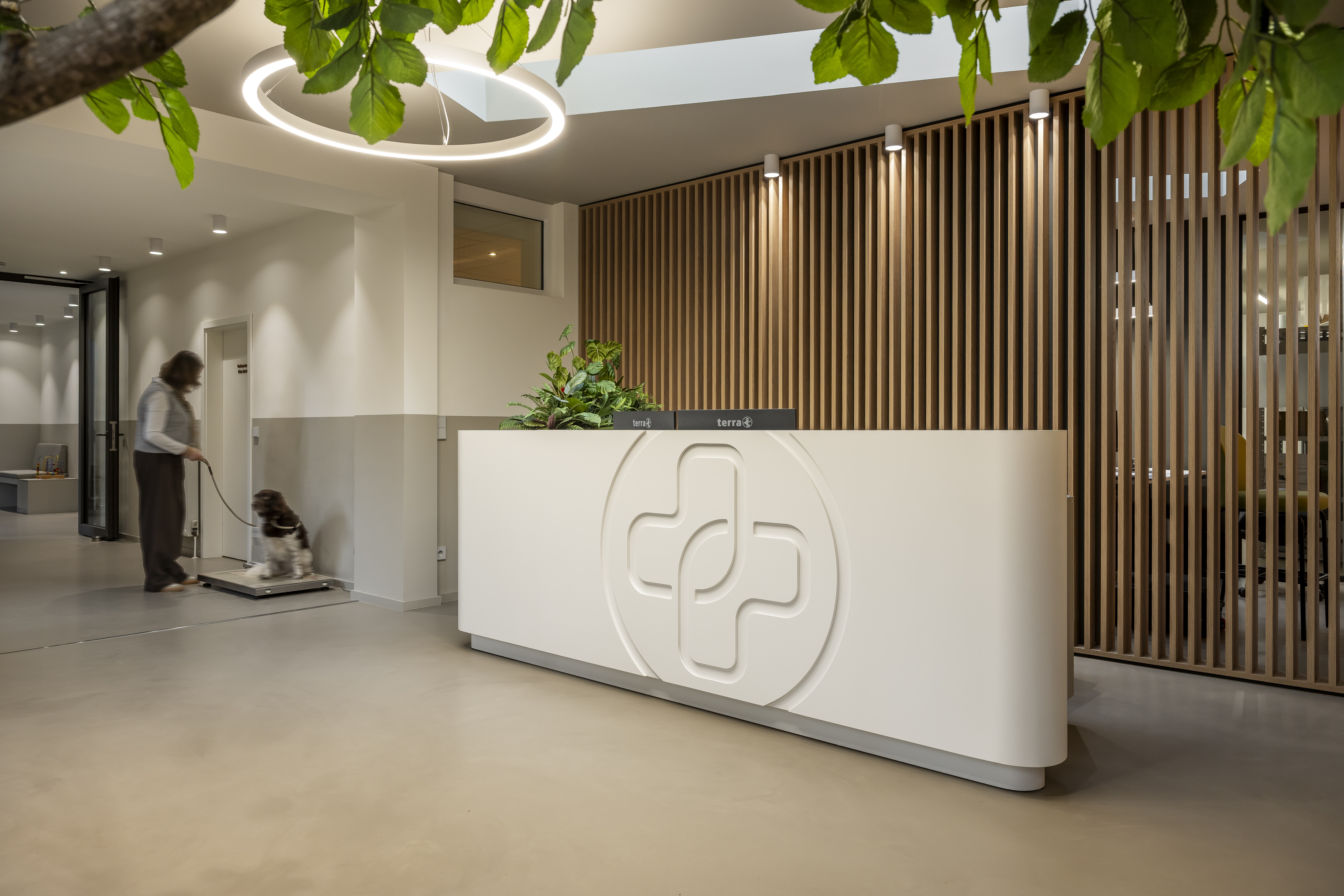 In samenwerking met Studio Feniks mocht JTV invulling geven aan de verbouwing en herinrichting van deze dierenkliniek in WietMarschen, Duitsland. De nieuwe huisstijl van de praktijk vormde een belangrijk vertrekpunt. In de vormentaal van het interieur komt de identiteit van de praktijk terug, zoals in de balie waarin een abstracte verwijzing naar het logo is verwerkt.